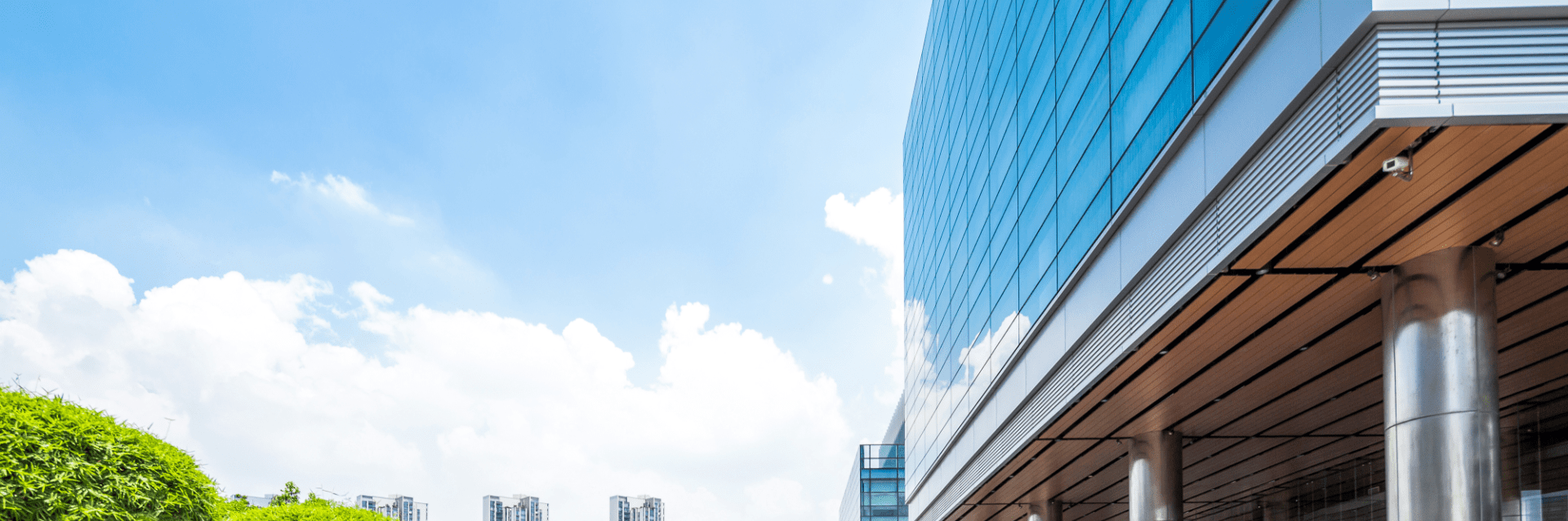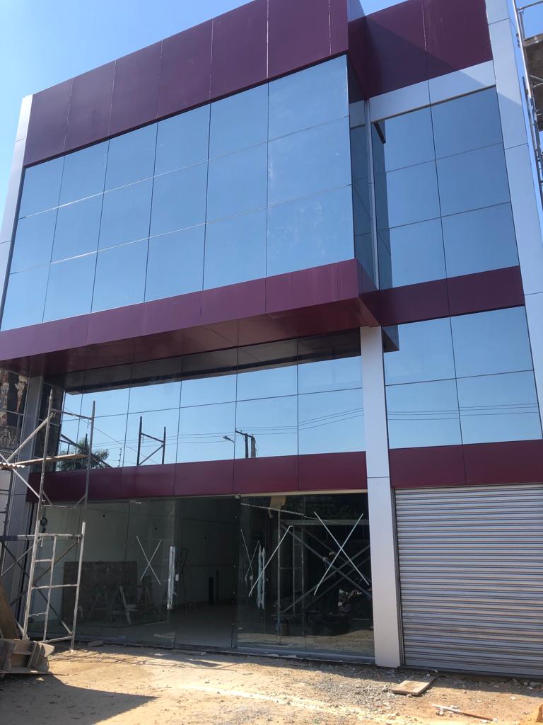 Fachada em vidro temperado, com revestimento em ACM. Cortinas metálicas recolhida em acabamento em ACM